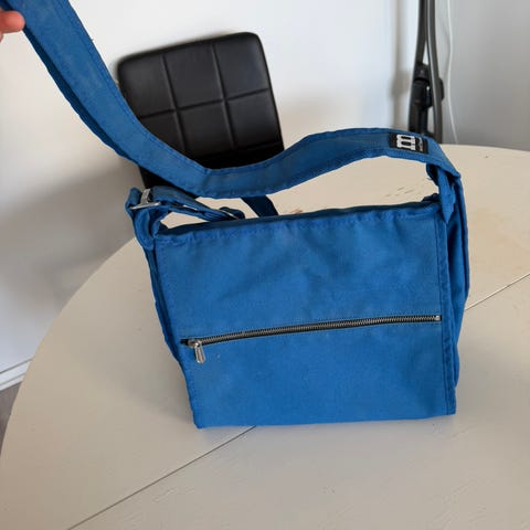 Myydään Marimekon vintage klassikko, Urbaani olkalaukku vaaleansinisenä. Laukku on ehjä, mutta väri hieman haalistunut, katso kuvat. Sisälläoleva pieni muovinen tasku nimilapulle myös rispaantunut. Tämä on pienempi versio laukusta, eli leveys x korkeus on 30 x 30cm.