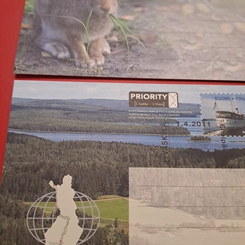 Posti kuvapostikortit, joissa aiheena suomalainen luonto. Korteissa on painettu postimerkki ja Priority-merkintä. Kuvapuolella on valokuvia joutsenista ja karhusta. Hinta 2 euroa+ pk 2.70