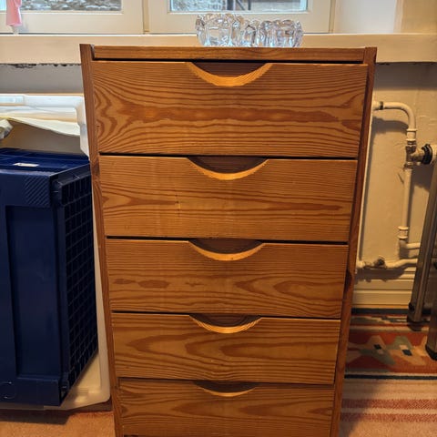 Lundian laatikosto / lipasto. Vanha, jossa aika paljon kulumaa. Alkuperäisessä kunnossa, ei ole maalailtu tai käsitelty. Takalevyssä reikä.