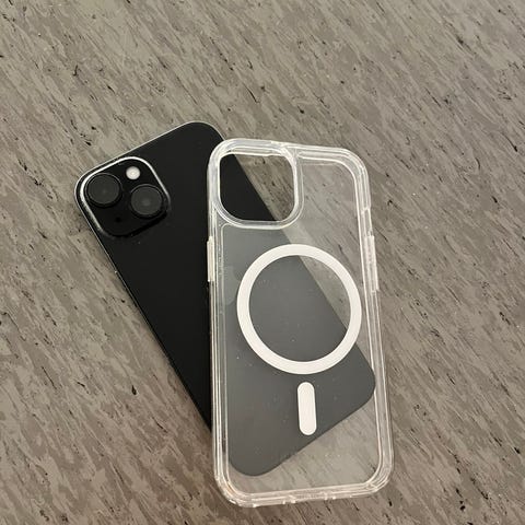 Apple iPhone 15 älypuhelin, tallennustila 128 GB. Värinä vaalea vihreä. Laitteessa on kaksoiskamerajärjestelmä takana ja etukamera näytön yläreunassa. Kosketusnäyttö koko etupinnan alueella. Sopii yleiseen älypuhelinkäyttöön, kuten puheluihin, viestintään, internetin selaamiseen ja sovellusten käyttöön. Kuvissa näkyy takakuoren kulmassa halkeamia, jotka vaikuttavat vain ulkonäköön, ei kameran linssiin. Akun varaustaso ja käyttötilastot näkyvät näytön kuvakaappauksessa ilmoitushetkellä.