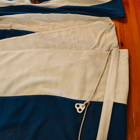 Myydään Suomen viiri. Pituus 108 cm, yläosan lev. 35 cm, alaosan lev. 10 cm. Kulmissa lenkit ja klipsit. Virheettömässä kunnossa.