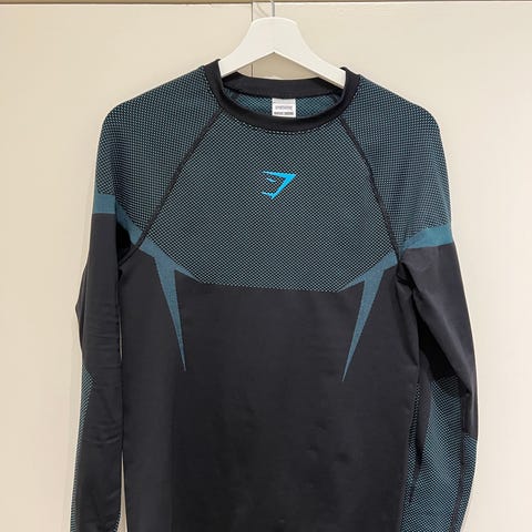 Myydään gymshark v5 pitkähihainen midnight blue koko M aito ja pussin saa myös mukaan :)