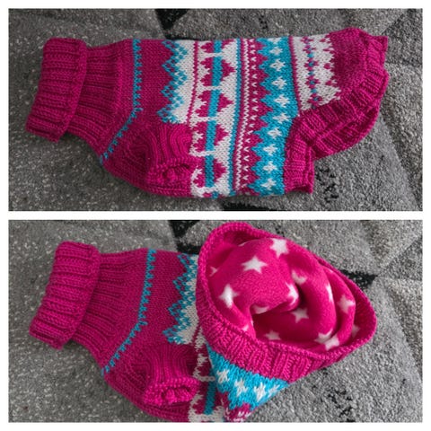 Harmaasävyinen kuviollinen neulepusero koiralle. Puserossa on korkea ribbineulekaulus, lyhyet hihat etutassuille sekä pidempi takaosa, joka suojaa selkää. Neuleessa on mustavalkoisia kuvioita ja joustavat resorit helmassa ja hihoissa, mikä auttaa istuvuudessa ja lämmöneristyksessä. Sopii viileään säähän lisälämmikkeeksi koiralle. Selän mitta 25 cm.