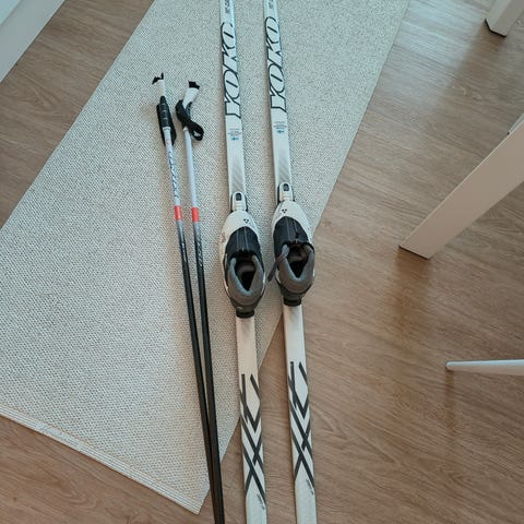 Sukset, sauvat ja monot. Olleet noin 180 pitkällä käytössä ja monot kokoa 45.