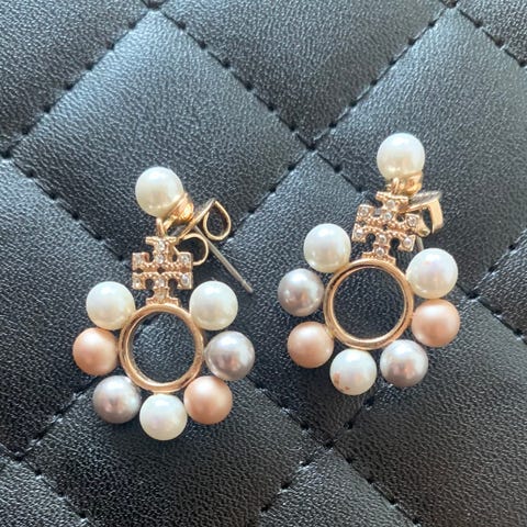 Tory Burch korvikset. Materiaali: messinki, titaani. Helmilaji: tekohelmi. Leveys 2.10 cm ja pituus 1,80cm. Tappikiinnitys. Kunto erittäin hyvä! Käytetty satunnaisesti!