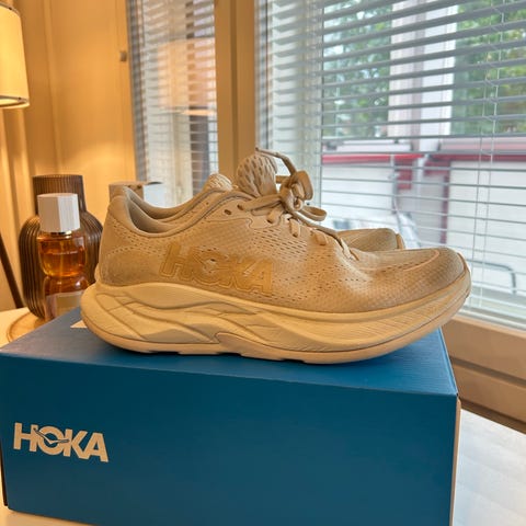 Hoka Clifton 8 tennarit, koko 39 1/3 osaa, Väri vaalea/valkoinen. Päällinen hengittävää tekstiiliä ja verkkokangasta, nauhakiinnitys. Paksu vaimennettu välipohja ja kuvioitu kumipohja. Sopivat arkikäyttöön ja kevyeen liikuntaan.