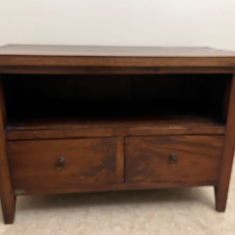 Kaksi ovea ja kolme hyllytasoa keskellä. Tason taka-osa kiinteä eli ei ole reikää johdoille. Noin 1,5m leveä. Nouto.