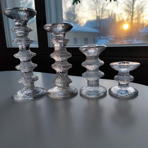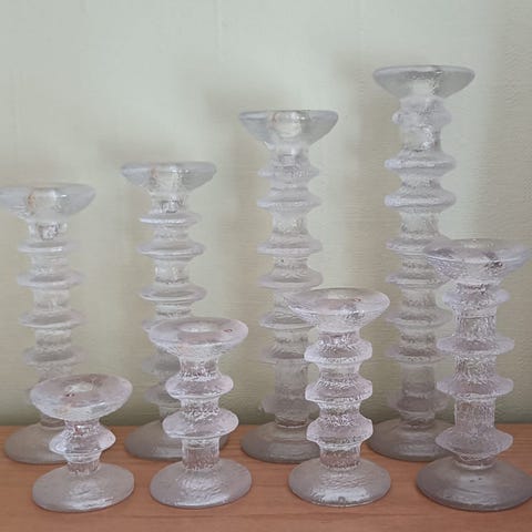 Iittala Festivo kynttilänjalat kirkasta lasia. Sarjaan kuuluvat eri korkuiset, jalustaltaan pyöreät ja rungoltaan kohokuvioidut lasiset kynttilänjalat. Sopivat kruunukynttilöille tai vastaaville. Kynttilänjalat soveltuvat käytettäväksi sisustuksessa esimerkiksi ruokapöydällä, tasoilla tai ikkunalaudalla yksittäin tai ryhmänä. Eli myynnissä kaikki kirkkaat Festivot 1-8 koot joissain signeeraus tarrat kaikissa. Lisäksi 2 kpl juhlamalleja 2 solmua nelosen korkeudella. Lisäksi todella harvinainen valkoinen opaali neljä solmua. Hinta kokonaishinta tai tarjous. En myy yksittäin.Kuva netistä tuotteista saa kuvan pyydettäessä.