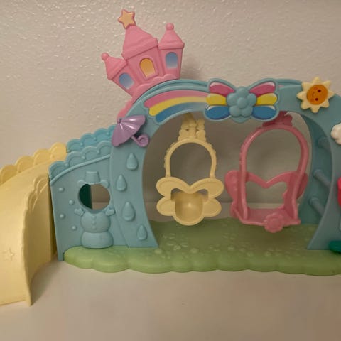 Sylvanian Families lasten sänky, liukumäki ja kolme pientä hahmoa + lelu.