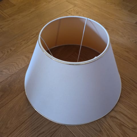 Isohko vaalea varjostin. Noin 48 cm leveä. Sisällä metallinen kiinnike, jolla varjostin laitetaan suoraan hehkulamppuun kiinni. Postitus (14e), tuonti (pk, 10e) tai haku. Kulkee metrolla keskustaan saakka.