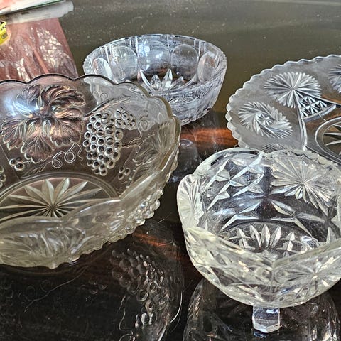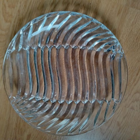Kristalli tarjoiluastiat, sokeri, karkit, makeiset yms.kirkasta kaiverrettu tai hiottu lasia. Useita erikokoisia ja -muotoisia kulhoja ja tarjoiluastioita, esimerkiksi pyöreitä