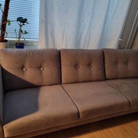 Harmaa sohva, jalat vaihdettavissa, Istuinsyvyys 55 cm, istuinkorkeus näillä jaloilla 45 cm, istuinpituus 150 cm