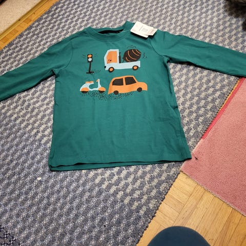 Traktori t-paita kokoa 110/116. Edessä pieni kuvanmukainen tahra ja takana helmassa nuppineulanpään kokoinen reiän alku.