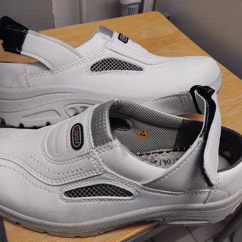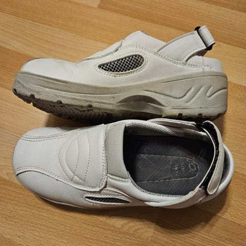 Uudet ja käyttämättömät Jalas-merkkiset työkengät tai -sandaalit, jotka tunnetaan mukavuudestaan ja ergonomisesta muotoilustaan. Ne on suunniteltu erityisesti pitkiin työpäiviin esimerkiksi teollisuudessa, laboratorioissa tai sairaaloissa, missä mukavuus ja tuki ovat tärkeitä.