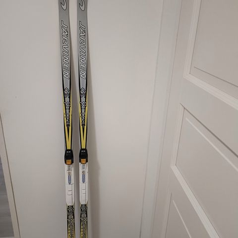 Käyttökelpoiset Järvisen sukset ja Salomonin monot suoraan 90-luvulta. Suksien pituus 195, painoluokka n.70-80kg. Monot kokoa 42.