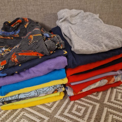98-104 kokoisia vaatteita. 8 paitaa, kaupan päälle kahdet pitkät kalsarit, kolmet alushousut ja yhdet leggingsit