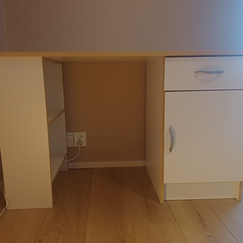 Valkoinen kirjoituspöytä, jossa suorakulmainen pöytätaso ja neljä laatikkoa, kaksi molemmilla sivuilla. Materiaalina puu tai puupohjainen levy. Pöytä soveltuu esimerkiksi työpöydäksi, läksypöydäksi tai kotitoimistoon. Neutraali valkoinen väri sopii monenlaisiin sisustuksiin. Vain nouto Metsokankaalta.