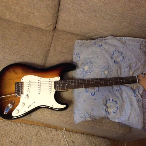 Sähkökitara on musta, valkoisella pleksillä ja kolmella yksikelaisella mikrofonilla, 5-asentoisella mikkikytkimellä sekä äänen- ja äänenvoimakkuudensäädöillä.