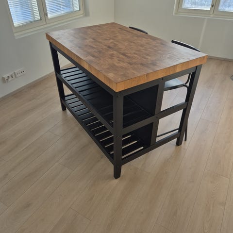 Meillä noin 3-4 vuotta ollut keittiön sydän etsii uutta kotia. Taso ollut meillä käytössä aktiivisesti, joten pinta kaipaa rakkautta. Työtason materiaali on ihan loistava sillä kevyt hionta ja öljykäsittely tekee tästä kuin uuden. Eli jos vaaleammat läikät tai pienet raot vaivaa niin ne saa tarvittaessa hoidettua pois. Yritin kuvata pintaa, mutta hieman haastava.
