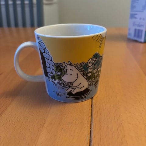 Arabia Muumi muki vihreällä pohjavärillä ja Muumi-hahmojen kuvituksella. Materiaalina keraaminen posliini. Sopii juomamukiksi arkeen ja kokoelmakäyttöön. Pohjassa Arabia Finland -leima ja Muumi-kuvitus.