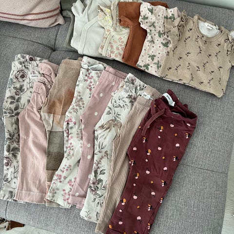 Vaatteita 74 kokoiselle. Hyväkuntoisia ihania vaatteita seuraavalle pienelle. Frillaleggareissa ihan pienet ruskeat täplät lahkeessa, yhdestä kukkamekosta kauluksesta puuttuu neppari. Ei vaikuta käyttöön. Lisäkuvat halutessa.