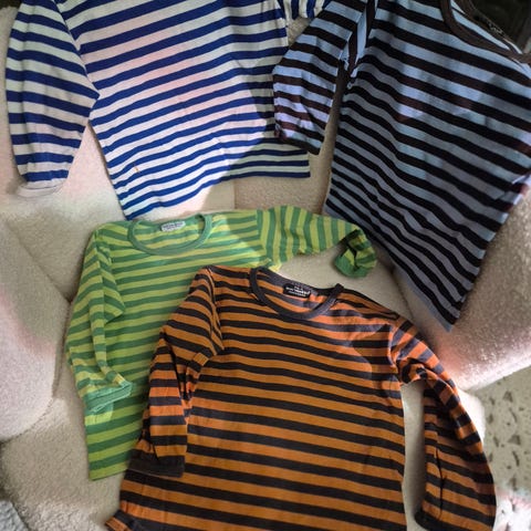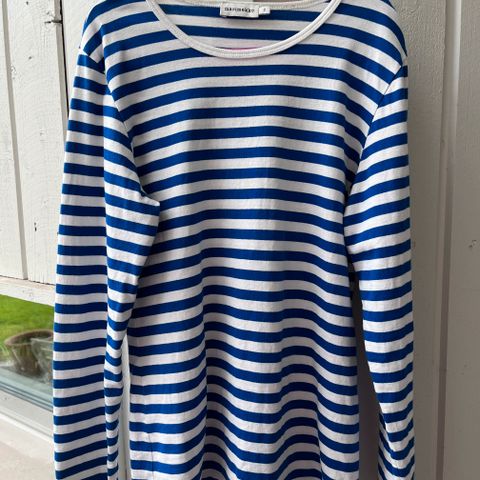 Marimekko tasaraita koko 150cm (vastaa xs/s) Muuten hyvässä kunnossa, kahta pientä "tahraa" haalentumaa lukuunottamatta (kummatkin on kainaloissa, katso kuvat.