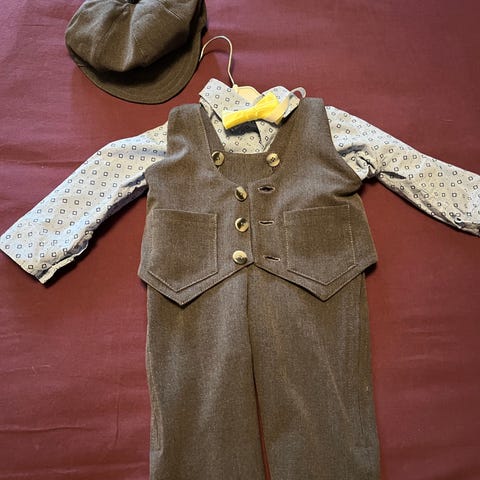 Pikkupojalle muutaman kerran käytetty juhlapuku: boby, liivi ja henkselihousut. Liivissä koko 62 muut 68, newbie