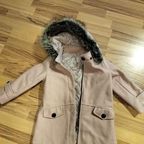 Vaalea takki hupulla, pieni karva reunus, edessä taskut