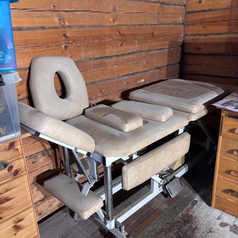 Hierontapöytä vihreällä pehmusteella, "matkamalli". Pöytä on taittuva ja varustettu metallirungolla. Pöydässä on kasvoaukko sekä erilliset käsituet. Mukana tulee erillinen vihreä tyyny. Soveltuu hierontaan ja muuhun hoitotyöhön, ja taittuu kokoon kuljetusta ja säilytystä varten. Painaa n. 15 kg, joten on aika tukeva.