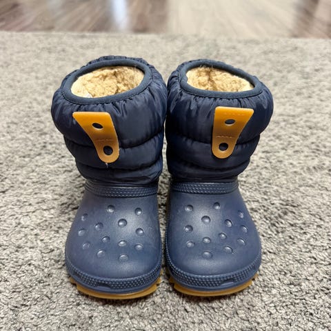Crocs talvisaappaat tytöille, koko 22-23. Väri vaaleanpunainen. Saappaissa on lämmin vuori ja kuminen, kuvioitu ulkopohja. Päällinen on vettä hylkivää materiaalia ja varressa on pehmustettu osa. Hieman likaa, katso kuvista!