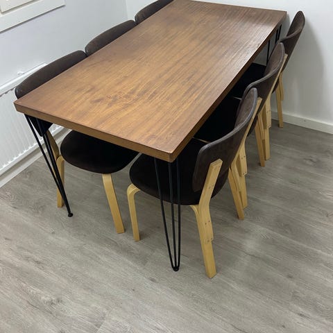 Pöydästä saa tarvittaessa helposti jalat irti ja jatkopala menee kätevästi pöydän alle. Jatkopalan leveys todennäköisesti n. 30 cm, tarkka mitta tulee vielä myöhemmin. Pöydän yleisilme on ikään nähden siisti!