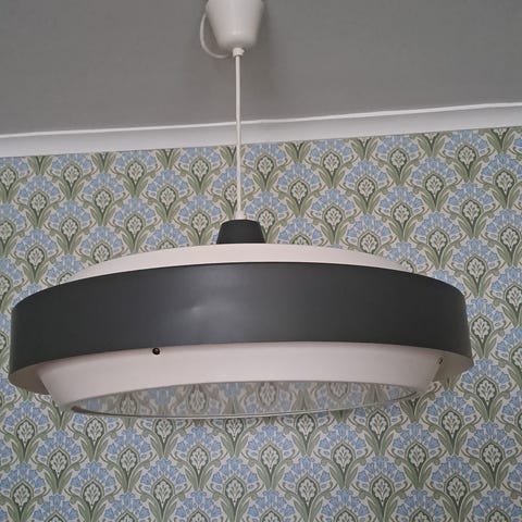 60-luvun kattovalaisin. Maalattua metallia. Käytönjälkiä löytyy, mutta ihan siisti yleisilme. Olisikohan tämä ruotsalainen Granhaga ja suunnittelija Carl Thorne, ei täyttä varmuutta.
