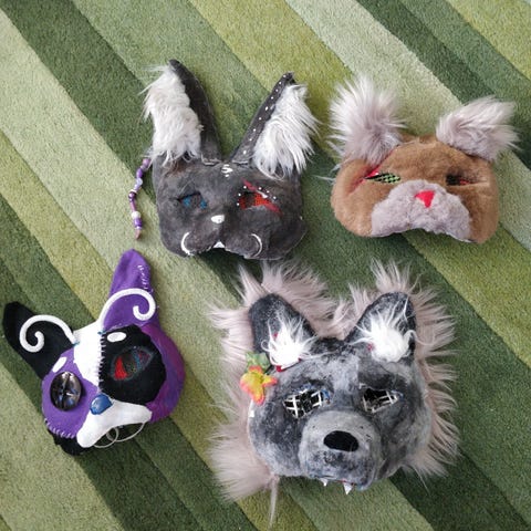 Upean pelottava luuranko kissa maski. Tehty maalaamalla huopaan akryylimaaleilla ja käyttämällä pahvista kissa maski pohjaa alla. Silmät over 'eye meshiä', josta näkee hyvin läpi kun maski on päällä. Käyttämätön.