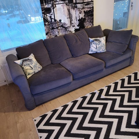 Siistikuntoinen 240 cm leveä sohva, joka sopii hyvin myös löhöilyyn. Siihen mahtuu kaverikin viereen. Tyynyjen täytteenä on höyheniä, joten tyynyt mukautuvat kivasti kun haluat rennon lepoasennon.