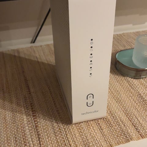 Technicolor musta modeemi. Laitteessa useita Ethernet‑portteja ja liitännät kaapelille sekä USB:lle. Mukana virtalähde ja verkkokaapeli. Soveltuu kiinteän verkon jakamiseen usealle laitteelle kotona tai toimistossa, tarkemmat tekniset tiedot ja tuetut yhteystyypit riippuvat mallikohtaisista asetuksista ja operaattorista.