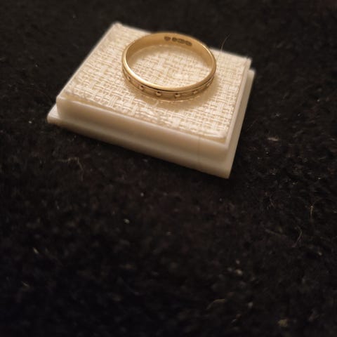 Materiaalina kulta. Sormuksessa on leveä, koristekuvioitu runko, jossa toistuva geometrinen kuviointi. Sopii käytettäväksi arjessa tai juhlatilaisuuksissa sekä naisille että miehille. Leveä.