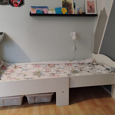 Myydään jatkettava lasten puinen sänky, mukaan vaahtomuovipatja kahdella jatkopalalla. Tukeva ja hyväkuntoinen muuten, maalipinnat paikoin ottaneet osumaa. Levypohja. Pituus 191 cm kahdella ja 157 cm yhdellä patjan jatkopalalla. Ilman jatkopalaa pituus 123 cm. Leveys päätyjen kohdalta 80 cm, patjaosan leveys 66 cm. Päätyjen korkeus 55 cm ja makuuosan 35 cm.