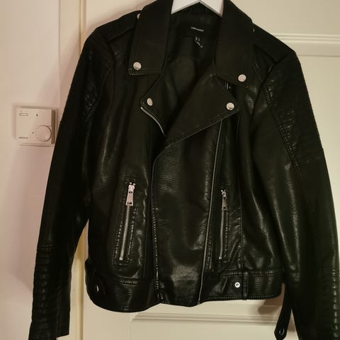 Lindex naisten takki, koko XL. Materiaalina tekonahka ja värinä musta. Malli on lyhyehkö ja siinä on pitkät hihat ja pienet vetoketjulliset taskut. Takissa on edessä vetoketju ja kauluksessa nepparikiinnitys.