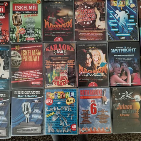 8 karaoke dvd-levyjä. Yksi ei näy kuvassa. Kaikki yhteensä 10€. Erikseen 3€/kpl.