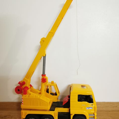 Toinen peili puuttuu, muuten hyvä nosturi. Auton pituus on 60 cm ja leveys on 20 cm. Puomin pituus on 120 cm.