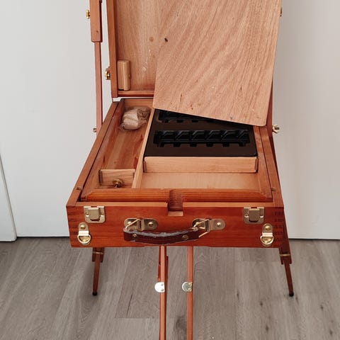Tästä teline ja salkullinen taidetarvikkeita ja ei muuta kuin maalaamaan.