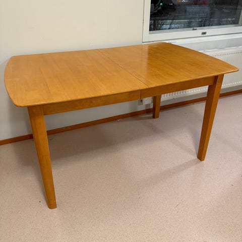 Annetaan korkeakiiltoinen ruokapöytä. Yhdessä jalassa on ollut halkeama, joka on korjattu huolellisesti: jalka on liimattu ja ruuvattu takaisin tukevasti kiinni. Pöytä on käytössä vakaa ja toimiva.
