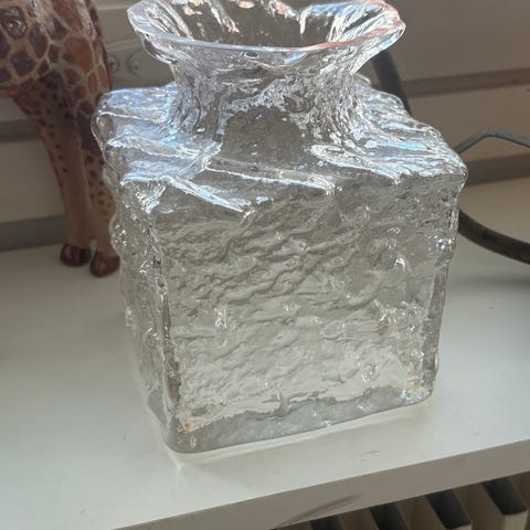 Iittalan tarra paikalla mutta siinä kulumaa. Ei halkeamia tai naarmuja. Suuaukon ulkoreunalla yksi 8mm iskemä, joka ei onneksi pomppaa silmään mutta huomaa kyllä lähemmässä tarkastelussa.