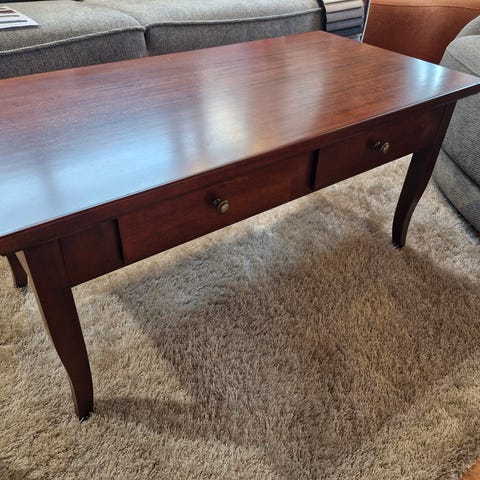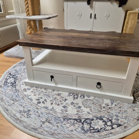 Kaunis rustiikkinen kermanvaalea sohvapöytä, tukeva tekoa ja aitoa puuta.