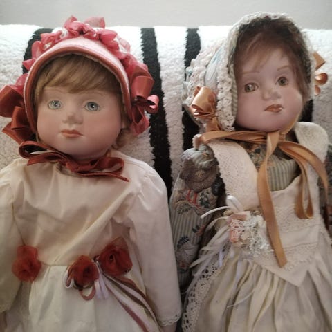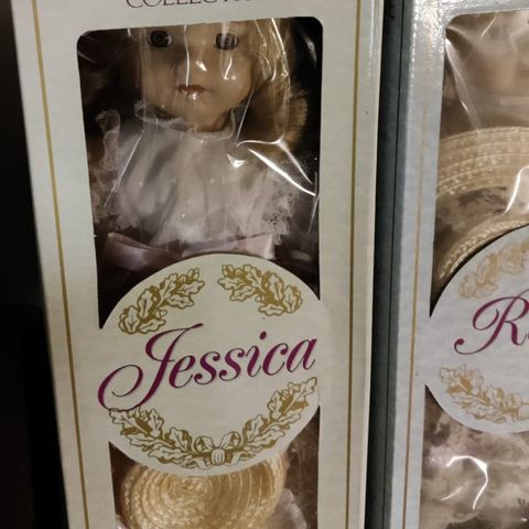 2 posliinista nukkea (eivät sovellu pienille lapsille). Mukana jalusta.