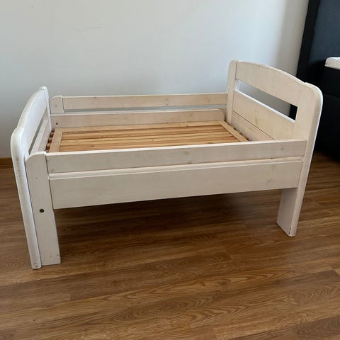 Valkoinen lasten jatkettava sänky. Lyhennettävissä n 100 cm ja jatkettavissa 185 cm. Mäntyä, kuultomaalattu valkoiseksi. Alkuperäismaalissa. Pieniä käytön jälkiä, siisti kunto.