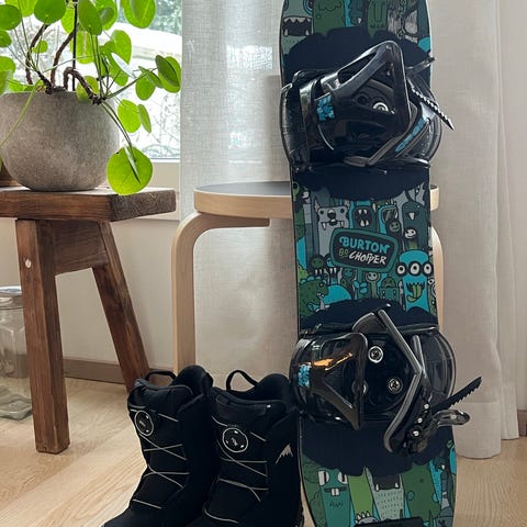 Burton Chopper lasten lumilauta ja Burton Zipline Boa -lumilautakengät. Laudassa värikäs perhoskuviointi violeteilla ja pinkeillä sävyillä sekä Burtonin lasten siteet, joissa on keltaiset ja pinkit osat. Lumilautakengät ovat Burton Zipline Boa -mallia, väriltään pinkki, valkoinen ja keltainen. Boa-kiristysjärjestelmä helpottaa kenkien pukemista ja säätämistä lapselle sopivaksi. Paketti soveltuu lapselle lumilautailun harjoitteluun ja rinteessä käyttöön.