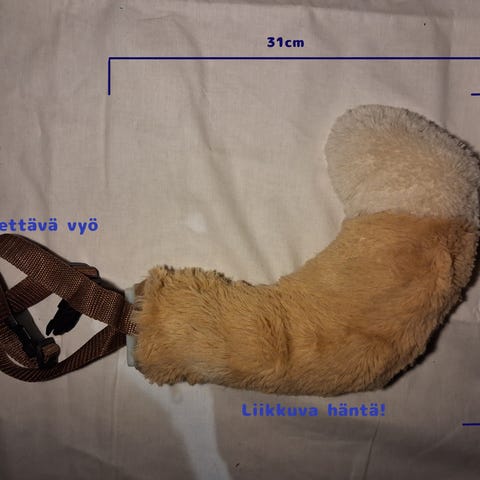 Lyhytkarvainen, pieni häntä. Hännässä kuminauha jolla sen voi kiinnittää vyöhön. Noin 15cmx13cm