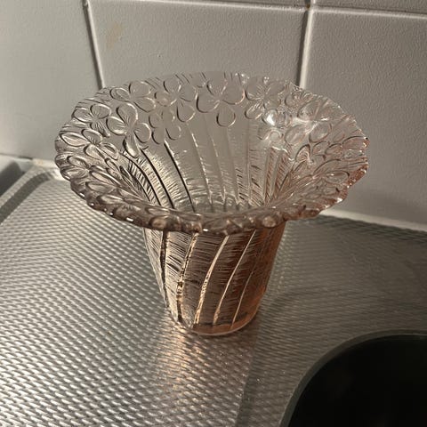 Riihimäen lasi lasinen maljakko. Ohdake. Kirkas, paksusta lasista valmistettu esine, jossa on koristeellinen, kohokuvioitu pinta ja aaltoileva reuna. 1930-luvulta. Kork.11,5cm. Halk.7,5cm.