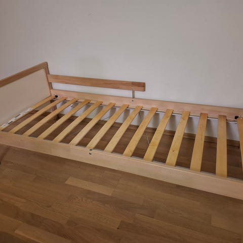 IKEA jatkettava juniorisänky, väri valkoinen. Sängyssä on laidat molemmilla sivuilla ja puinen sälepohja patjalle. Sopii lapselle siirtymävaiheeseen pinnasängystä isompaan sänkyyn.